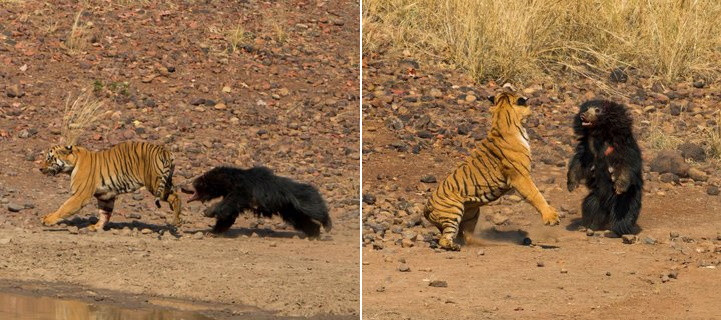 Схватка между бенгальским тигром (Panthera tigris bengalensis) и медведем-губачом (Melursus ursinus) произошла в заповеднике Тодоба Андхари в Индии. На камеру ее удалось запечатлеть 33-летнему гиду Арпиту Пареху.