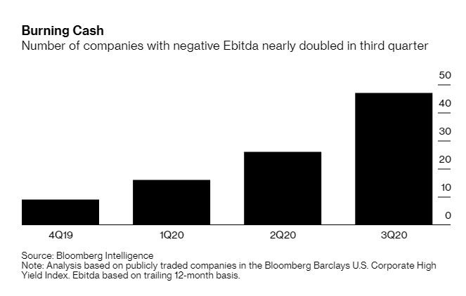 Таких "суперзомби", согласно Bloomberg Intelligence, выявлено 47 среди 600 обследованных компаний мусорного рейтинга, т.е. 7.8%. Реально их больше, конечно, так как в выборке нет непубличных компаний (они просто не обязаны сдавать отчетность установленного образца).