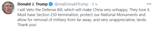 «Я заветирую оборонительный законопроект, что очень огорчит Китай. Он им нравится. Должно быть приостановлено действие раздела 230, защищены наши национальные памятники и разрешен вывод войск из далеких и очень неблагодарных стран», - написал действующий президент США в своем Twitter.