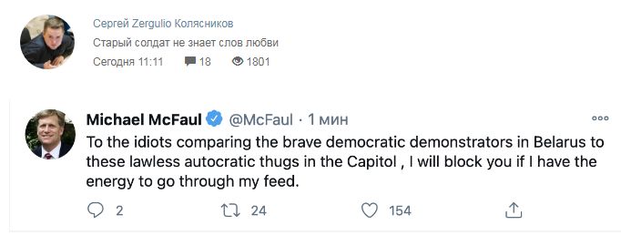 Майкл Макфол обиделся на сравнение беспорядков в США с Белоруссией