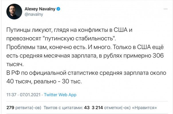 Будет ли Навальный писать что-то вроде "Американцы крутые!"? Поздравят ли захвативших Капитолий Варламов, Яшин, Соболь, Волков и другие? Ах да, ЭтоДругое же, ПониматьНадо!