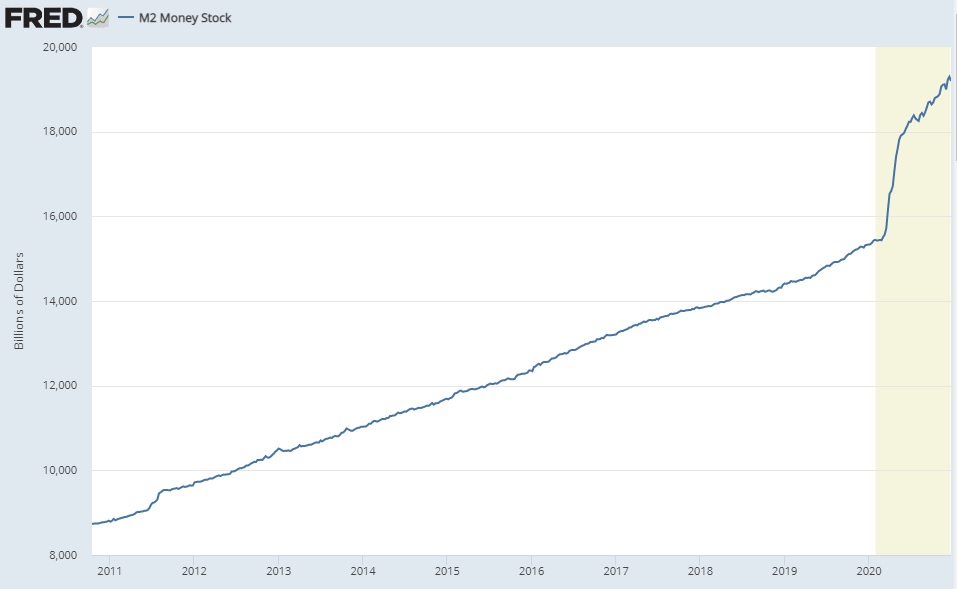 Если к началу 2020 денежная масса в США составляла 15,3 трлн долларов, то на конец года уже 19,2 трлн. Рост на 25% за год. Подобное изменение денежной массы в столь короткий срок неизбежно должно привести к инфляции доллара. И тут возникает вопрос: «Что будут делать с этим новая администрация США?»