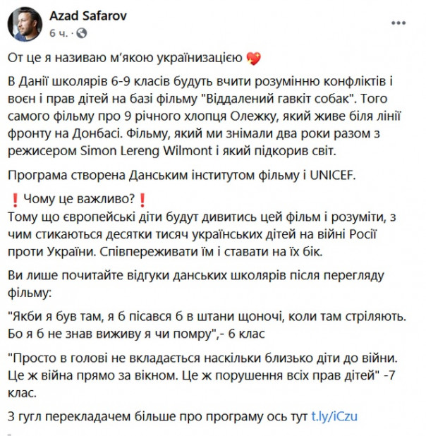 «В Дании школьников 6-9 классов будут учить пониманию конфликтов и войн и прав детей на базе фильма "Лай собак вдалеке". Того самого фильма о 9-летнем мальчике Олежке, который живет возле линии фронта на Донбассе. Фильма, который мы снимали два года вместе с режиссером Симоном Леренгом Вильмонт и покоривший мир», — написал он.