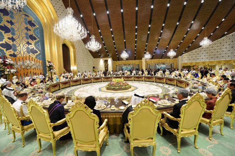 Дворец имеет золотой купол. Он вмещает 1788 комнат, 257 ванных, 18 лифтов, 44 лестницы, 5 бассейнов, конюшни на 200 лошадей, оснащенные кондиционерами, мечеть и подземный гараж. Банкетный зал способен вместить до пяти тысяч человек. Общая площадь дворца — свыше 200 000 м², а его стоимость составляет более 1,3 миллиарда долларов