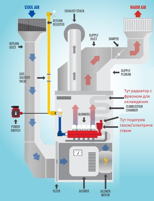 Основным источником энергии являются электричество и газ: в этих домах/апартаментах с помощью системы воздуховодов подогретый или охлаждённый воздух доставляется во все помещения. Подогрев или охлаждение происходят в печи (furnace). Воздух затягивается через воздуховоды в квартире/доме, проходит через фильтр, далее идёт блок отопления (газовый/электрический), далее радиатор с фреоном для охлаждения, далее попадает в распределительную коробку, откуда уже идёт к потребителям. Соответственно, нужно тепло - включён только блок отопления, нужен холод - гоняется фреон (для этого ставят внешний блок на улице).