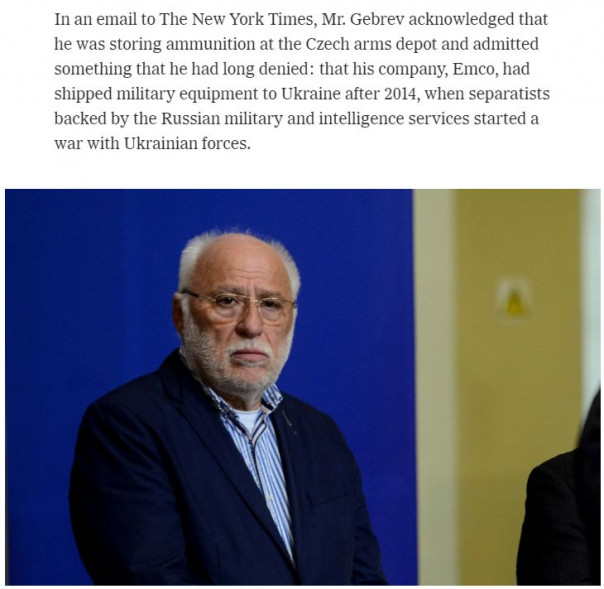 Гебрев ранее отрицал поставки на Украину после начала конфликта на востоке страны, отмечает New York Times. В письме от 23 апреля он сказал, что Emco в конце 2014 года подписала контракт с "авторизированными украинскими компаниями". Перед этим он отметил, что боеприпасы, хранящиеся на складе во Врбетице, не были выделены для поставок на Украину.