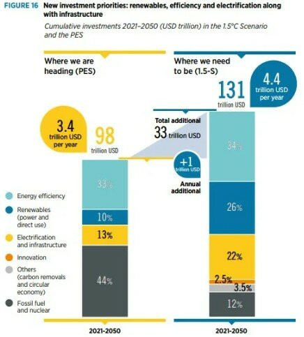 Кроме того, международное агентство по возобновляемым источникам энергии (IRENA) опубликовало прогноз, в котором фактически признало провал альтернативной энергетики в деле по улучшению воздействия на климат. Согласно прогнозу, альтернативные возобновляемые источники энергии требуют ежегодного инвестирования в своё развитие более 4,4 триллионов долларов только для того, чтобы удержать глобальное потепление в пределах 1,5 градусов Цельсия, выполнив тем самым парижские соглашения о климате к 2050 году.