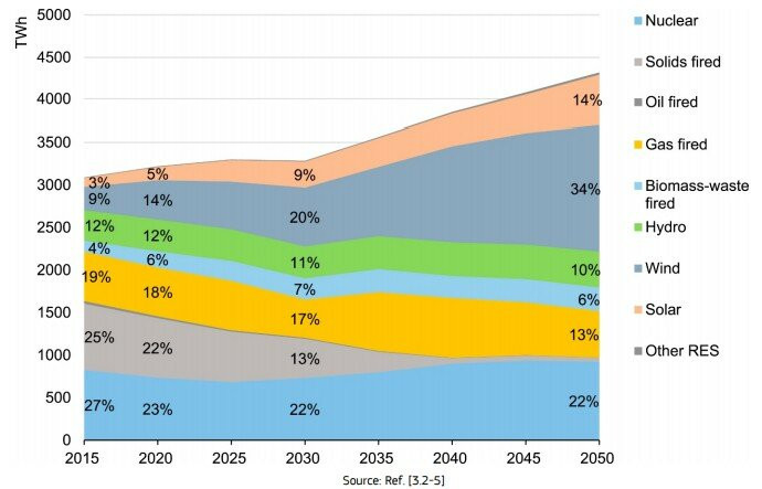 Прогноз производства электроэнергии по источникам в ЕС. Как видим, ядерная энергетика к 2050 году никуда не денется, а займёт 22% в энергобалансе стран ЕС, обеспечивая базовую генерацию энергии.