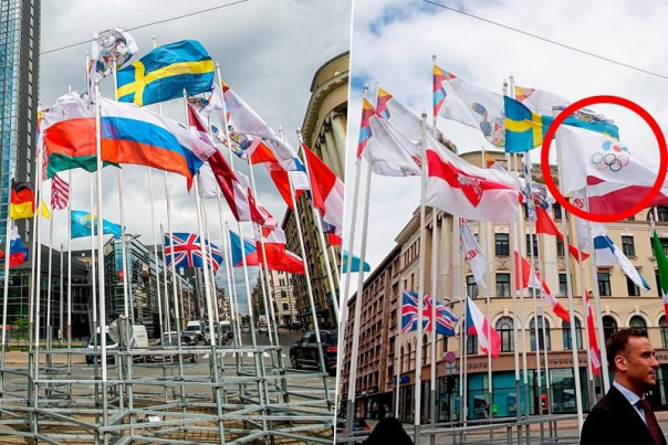 В понедельник в Риге убрали российский триколор с площади, где размещены флаги всех стран — участниц чемпионата мира. Государственную символику заменили на флаг Олимпийского комитета России (ОКР).