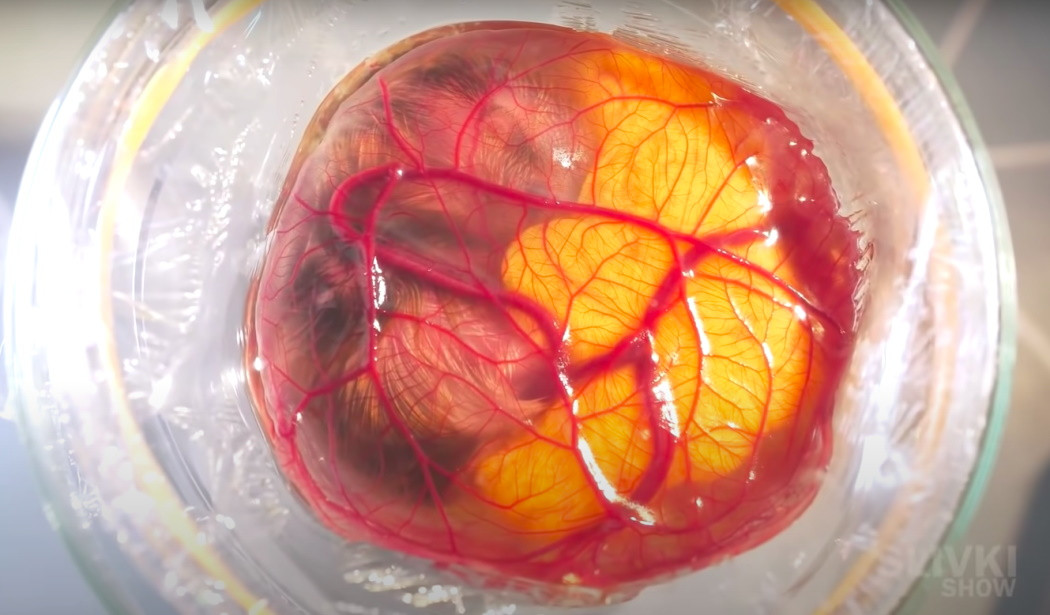 Украинский видеоблогер снял скорлупу с обычного куриного яйца и поместил внутренности в специальный стакан-инкубатор. Это позволило ему отслеживать и наблюдать за развитием куриного эмбриона от момента первого удара сердца до полного развития цыпленка.