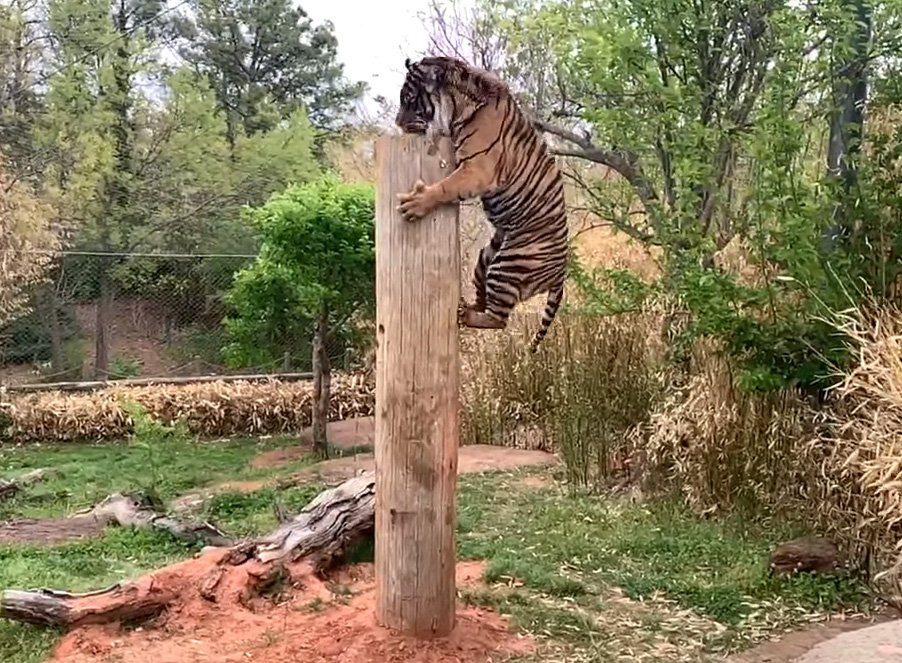 Величина столба, на вершине которого тигра ждет вкусная награда, в данном случае не сообщается, но известно, что тигры, чьи размеры варьируются от 2,2 до 2,55 м, могут прыгать на пятиметровую высоту. Густи не оплошал: он с первого раза допрыгнул до верхушки столба, ухватив лакомство. Источник