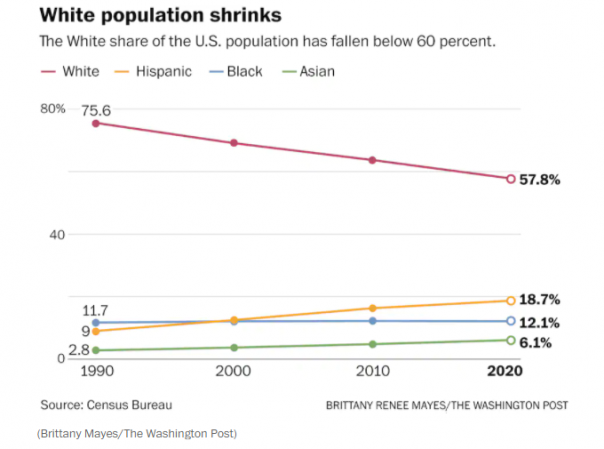 Одновременно с этим белые впервые составили в процентном отношении менее 60% населения. Теперь их лишь 57,8%, в то время как в 2010 году этот показатель составлял 63,7%.