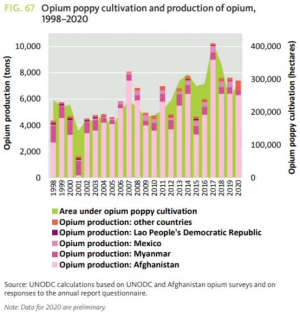 Вердикт о том, что страна является лидером в производстве опия, в докладе 2021 года вынесло Управление ООН по наркотикам и преступности (UNODC). По данным UNODC, на долю ИРА в период 2015-2020 годов приходилось 83 % мирового производства опия. Это при том, что в 2019 году на страну приходилось 69 % мировой площади выращивания опиумного мака.