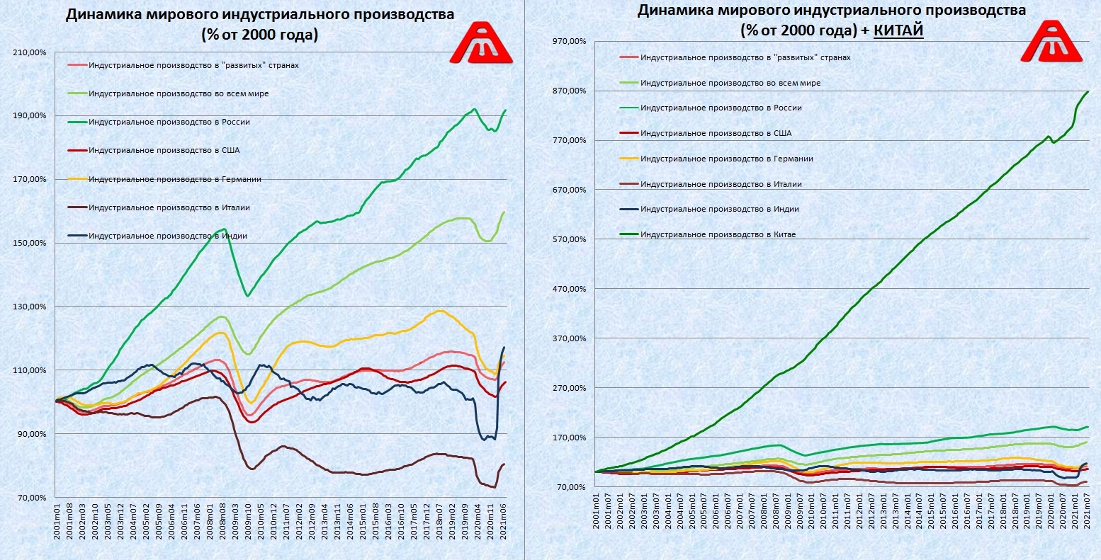 12. Индустриальное производство в процентах от уровня 2000 года (два графика отличаются исключительно наличием Китая и связанным с этим масштабированием):