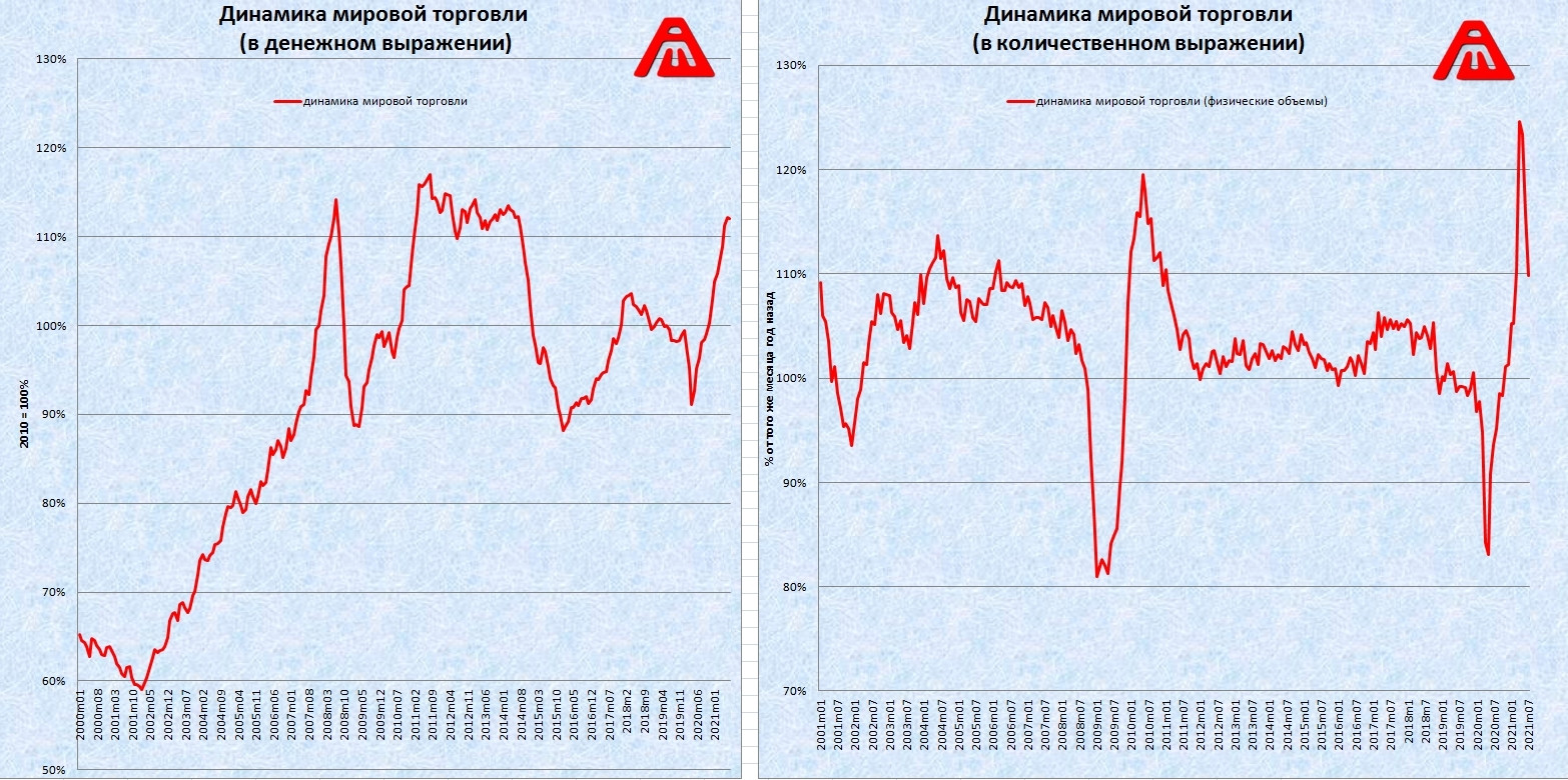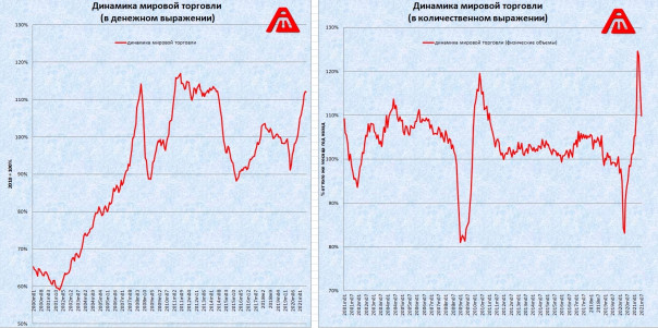 1. Мировая торговля в количественном измерении (физические объемы) в плюсе по сравнению с тем же месяцем год назад на 9.85% и на 2.84% выше 2019 года.