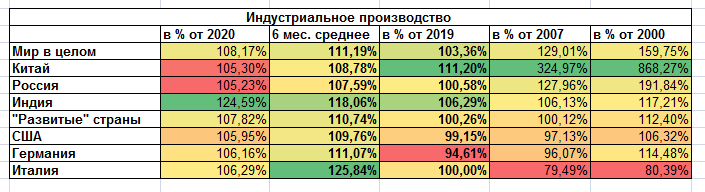 - США и Германия так и не смогли вернуть промпроизводство на уровень 2019 года (99.15% и 94.61% от 2019 соответственно), более того, оно у них хуже и 2007 года (97.13% и 96.07% соответственно);