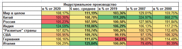 6. Индустриальное производство в целом по "развитым" странам в плюсе по сравнению с тем же месяцем год назад на 7.82% и на 0.26% относительно 2019 года.