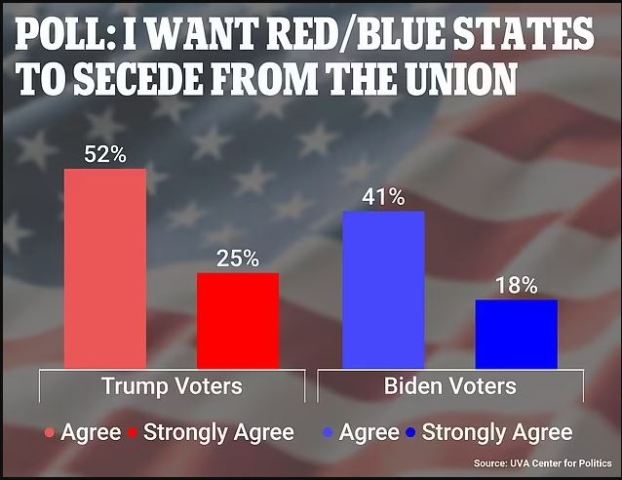 Согласно новому опросу Центра политики Университета Вирджинии, более половины избирателей Трампа (52%) и 41% избирателей Байдена выразили поддержку расколу страны по политическим мотивам.