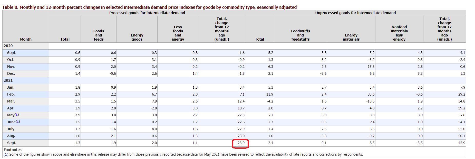 - цены на товары промежуточного спроса (intermediate demand PPI, это то, что еще предстоит обработать, перед тем как превратится в товары) выросли на дикие 23.9%, обновив почти полувековой рекорд с середины 70-х)