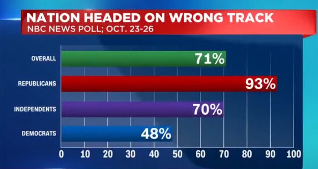 Согласно опросов, проведенных NBC в октябре, только 22% американцев считают, что страна движется в правильном направлении, 71% думают обратное. Основную часть несогласных составляют республиканцы - 93%, среди независимых избирателей - 70%, но даже среди демократов, почти половина - 48% тоже считают, что страна движется не туда.