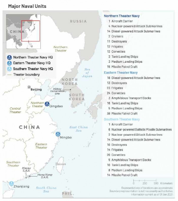 «Имея в своем флоте 355 кораблей, Военно-морской флот Народно-освободительной армии планирует расширить свой арсенал до 420 кораблей в течение следующих четырех лет, согласно оценкам ежегодного военного доклада Пентагона по Китаю. Ожидается, что к 2030 году в составе ВМФ НОАК будет 460 кораблей. Цифра 355 учитывает “ надводные боевые корабли основных классов, в том числе подводные лодки, авианосцы, океанские десантные корабли, корабли противоминной обороны и вспомогательные средства флота”, согласно отчету, который охватывает события в 2020 году…Большая часть этого роста будет приходиться на крупные надводные боевые единицы”, — говорится в докладе. В докладе, который ежегодно утверждается Конгрессом, описывается, что военно-морской флот Китая имеет растущие амбиции работать с более универсальными морскими платформами за пределами Индо-Тихоокеанского региона»