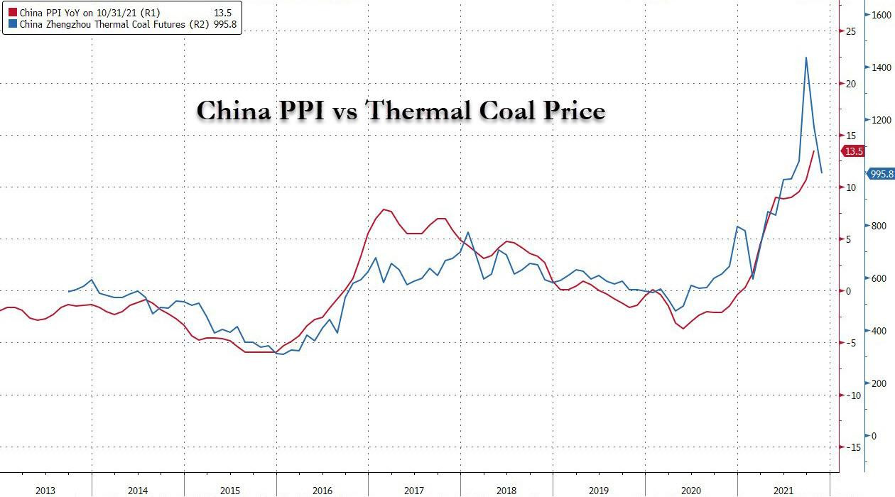 Вслед за США, где инфляция цен на товары промежуточного спроса достигла 25.4%, обновив рекорд с 1975, статистика Китая сообщает, что цены производителей (PPI) в октябре выросли на 10.7% по сравнению с тем же месяцем год назад, что является рекордом за весь период наблюдений, т.е. по меньшей мере с ноября 1995 года.