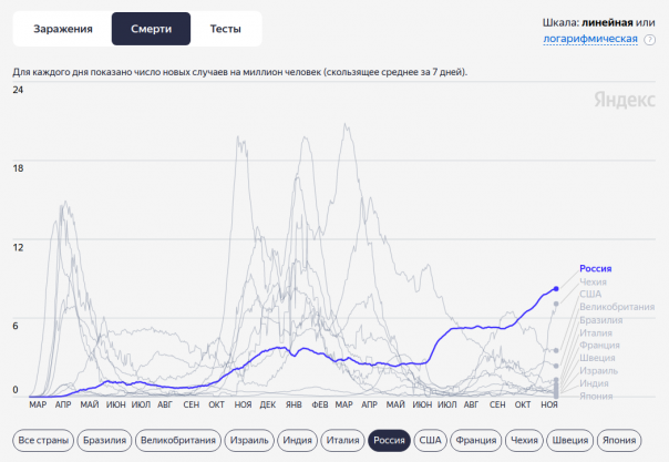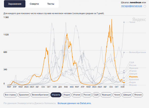 Нужны комментарии? Статистика взята отсюда. а там она по данным Университета Джонса Хопкинса. Кстати, вакцинация в Израиле затормозилась. Уперлась в ортодоксов. Но их просто ограничили жестоко - не хочешь не надо. Но сиди дома. Впрочем, взрослое население привито на 90%. И уже почти половина ревакцинирована.