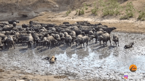 Крупное стадо буйволов пришло на водопой, где их уже поджидал прайд, состоящий из трех десятков львов. Им удалось схватить несколько самых юных особей, но буйволы, заметив потери в своих рядах, вернулись и отогнали врагов.