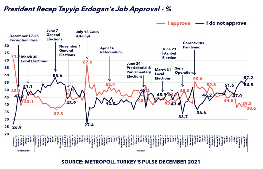 В опросе за декабрь 2021 баланс одобряющих и неодобряющих работу Эрдогана граждан (баланс давно уже отрицательный) скатился уже до неприличных значений. Минус 19% (!)