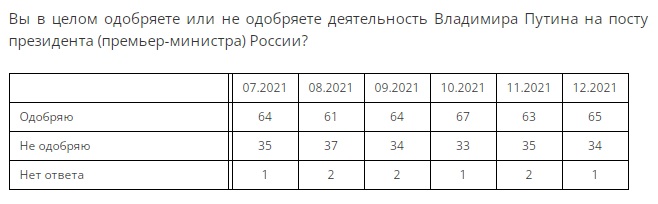 Для справки: ровно в этом же месяце (текущий декабрь 2021) и по аналогичному опросу (рейтинг одобрения деятельности на посту президента) от иноагента "Левада" у Путина плюс 31%:
