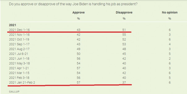 Для сравнения: ходячее фиаско Джо - "лэтс гоу Брэндон"- Байден сейчас по аналогичному рейтингу одобрения деятельности на посту президента имеет минус 8%. При том, что начал год с плюс 20% (!)