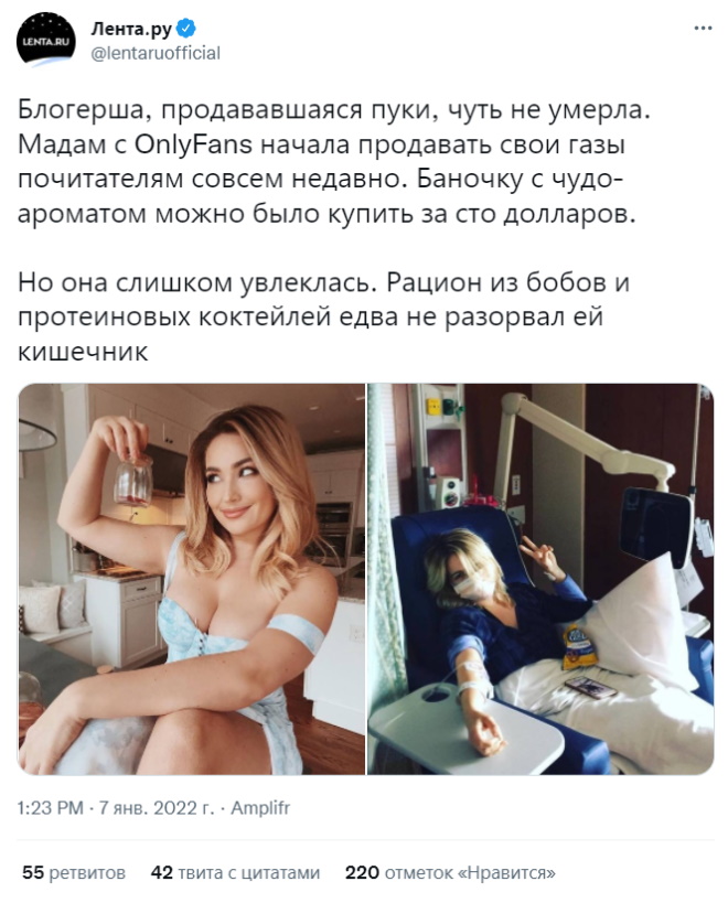 Уплатить $100 за возможность нюхнуть содержимое кишечника тёLки с OnlyFans — это, конечно, просто адовый трэш. Кстати, оная тёLка хотя бы выглядит нормально. Товарищ Мараховский как-то потрудился запостить фотографии двух самых востребованных и много зарабатывающих инфлюенсерок с названной платформы, и эти снимки многое говорят нам о дегенеративных вкусах аудитории OnlyFans, так что, увидев сии фото, насчёт покупки сугубо удушливых газов из кишечника блогерок, можно не удивляться.