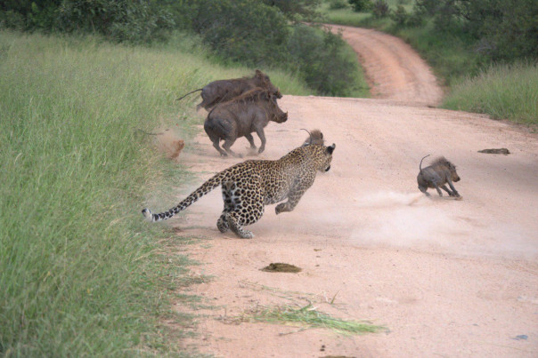 Туристы, осматривавшие Национальный парк Крюгера в ЮАР, стали свидетелями интересной сцены из мира дикой природы. Услышав тревожные звуки, издаваемые белкой, они догадались, что неподалеку может находиться хищник. Осмотр местности ничего не дал, и неудивительно: леопарды — отличные мастера маскировки. Чуть позже наблюдатели все же увидели самку, отдыхающую среди ветвей, но не успели насладиться этим великолепным зрелищем, как та соскочила с дерева и спряталась в высокой траве у дороги. Она издали заметила семейство бородавочников и приготовилась к атаке.