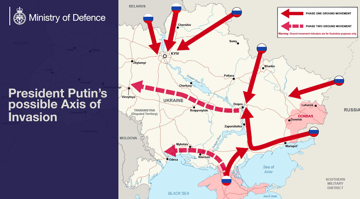 На схеме под названием "Возможная ось вторжения президента Путина", представленной в официальном Twitter ведомства, стрелками изображены две фазы наземного наступления.