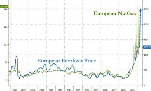 И, к сожалению, теперь мы можем с уверенностью предсказать, что грядущий продовольственный кризис ударит по каждой стране, которая использует пищевые удобрения - и это все, потому что несколько минут назад российский Интерфакс сообщил, что в рамках контрсанкций Москвы, Россия рекомендовала производителям удобрений прекратить экспорт, что приведет не только к орбитальному росту цен на удобрения, но и ко всем ценам на продовольствие.