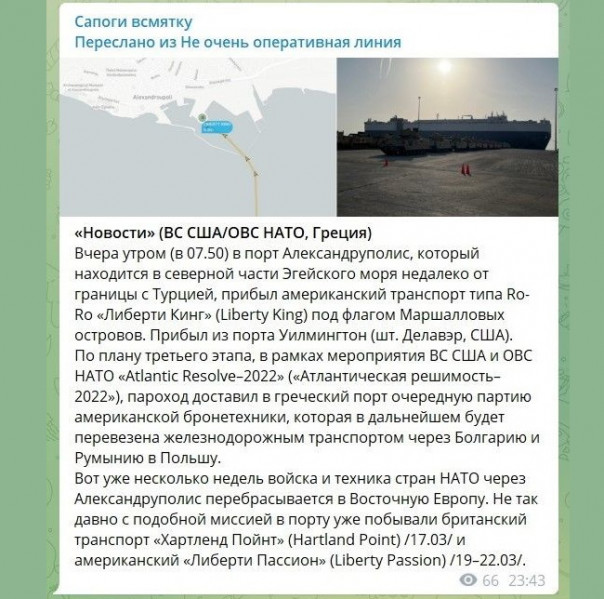 Сообщение от 20 марта: «Американское транспортное судно Liberty Passion доставило бронетехнику и военное снаряжение в порт города Александруполис на севере Греции. Груз в дальнейшем будет переброшен в Польшу… Ранее в том же порту пришвартовался британский паром Hartland Point с натовским военным снаряжением. Прибытие двух больших военных транспортных кораблей НАТО осуществляется в рамках операции Atlantic Resolve 2022 Североатлантического альянса».