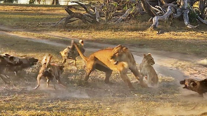Силу материнского инстинкта наглядно продемонстрировала львица, которая вместе с детенышем отдыхала на дороге в заповеднике Moremi Game Reserve (Ботсвана, Африка). В какой-то момент они привлекли внимание стаи гиеновидных собак: те вначале преследовали антилопу импалу, но потом переключились на другую потенциальную добычу, пусть и менее сытную — беззащитного львенка.