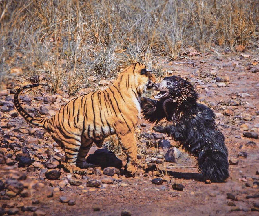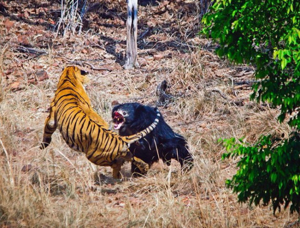 Тигр — один из самых грозных хищников в дикой природе. Именно эти животные в первую очередь населяют Национальный парк Тадоба (Tadoba Andhari Tiger Project) в индийском штате Махараштра. Там полосатые хищники чувствуют себя полноправными хозяевами: вот почему 7-летний самец по кличке Маткасур, отдыхавший в пруду в марте 2018 года, очень удивился, когда из-за кустов появилась медведица-губач (лат. Melursus ursinus) с малышом.
