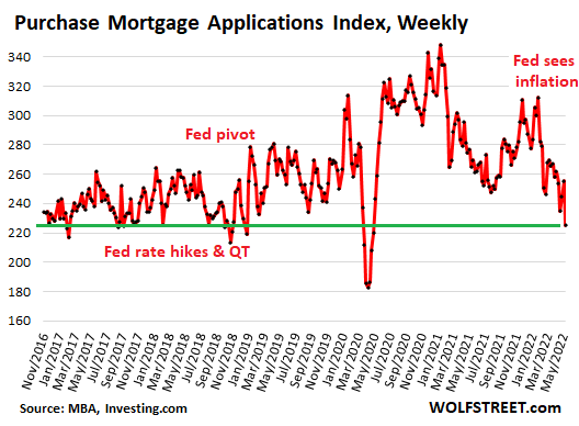 Индекс заявок на покупку ипотечных кредитов MBA упал до минимумов конца 2018 года. Тогда ФРС повышала ставки, и её QT поднял ставки по ипотечным кредитам чуть выше 5%, объём продаж упал, а цены начали колебаться и снижаться на некоторых рынках. Но инфляция тогда была ниже целевого показателя ФРС. Сейчас бушующая инфляция является доминирующей экономической проблемой, и ФРС полна решимости взять её под контроль (данные от Investing.com ):
