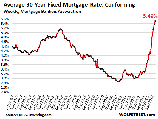Средняя 30-летняя фиксированная ставка по ипотечным кредитам с соответствующими балансами и 20% на этой неделе немного снизилась до 5,49%, по данным MBA today, с 5,53% на предыдущей неделе, что является самым высоким уровнем ставок по ипотечным кредитам с 2009 года (данные от Investing.com ):