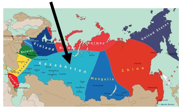 Обратим внимание и на долю Казахстана. Ему авторы карты отдают всю промышленность Урала, все месторождения Западной Сибири (там одна Тюменская область чего стоит), крупнейшие реки (Волгу, Иртыш, Обь), порты на Каспийском море, мегазавод «Норникель» и т.д.