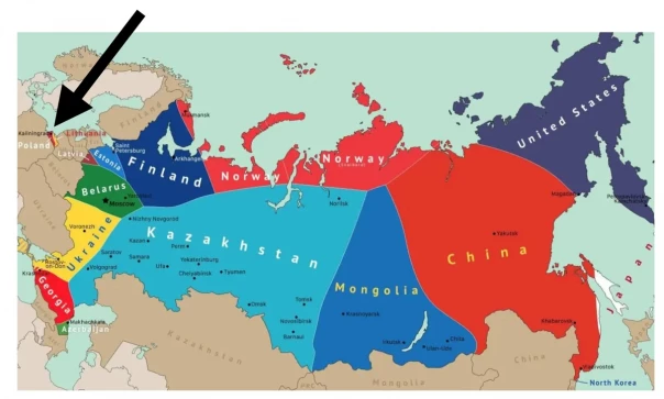 Эта карта показывает, какая страна будет ближе всего к путешественнику, находящемуся в той или иной точке России. Только то и всего.