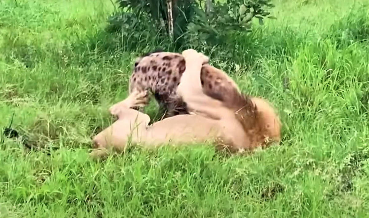 К счастью для гиены, лев на долю секунды ослабил хватку, а она воспользовалась этим шансом и убежала. Леопард также оказался в безопасности на дереве, а лев пустился не стал терять времени и пустился в погоню.