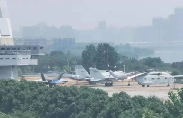 Сухопутный полноразмерный макет авианосца с палубной авиацией. Слева, хвостом к камере - макет или прототип J-35