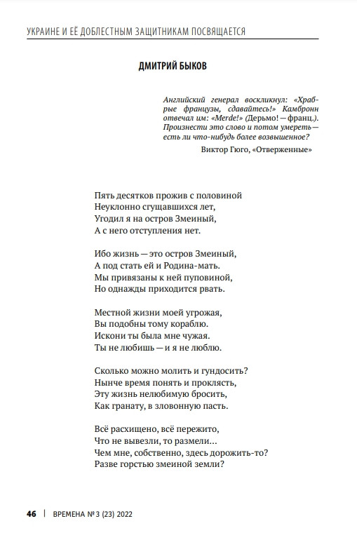 А вы думаете, российские проза- и стихоплеты либерального разлива спят, когда идет военная операция? Нет, они плюют в Отечество, уверенные, что им за это ничего не будет. В журнале «Времена» (издается в Бостоне, США) Дмитрий Быков (нам не поясняют, кто он и откуда) сравнивает Россию со Змеиным островом. Пишет: «Ибо жизнь – это остров Змеиный, а под стать ей и Родина-мать. Мы привязаны к ней пуповиной, но однажды приходится рвать».