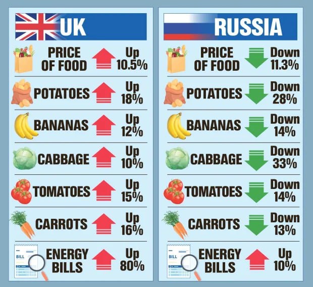 Британский таблоид The Sun пишет, что несмотря на угрозы «подорвать экономику России», Великобритания испытывает серьезный кризис, сопровождающийся резким ростом цен на продукты питания и энергетику, пока в России цены в основном снижаются.
