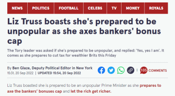 Оправдывает же Трасс это тем, что правительство Великобритании боится лишиться инвестиций, что чревато нанесением ущерба стране. Обычные обыватели тем временем не знают, как сводить концы с концами, поскольку заботливое правительство, ссылаясь на "ужасного Путина", увеличило стоимость счетов в три раза. При этом не забывая оказывать поддержку небытовым потребителям, наживающимся на потребителях нуждающихся.