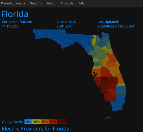 По данным PowerOutage.us . Наибольшее количество отключений электричества приходится на юго-западный регион Флориды, где ураган обрушился на берег.