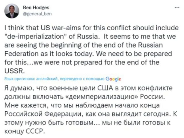 Бывший американский главнокомандующий Бен Ходжес в своем Twitter-аккаунте опубликовал любопытное признание, где высказал мнение об истинных военных целях США в конфликте.