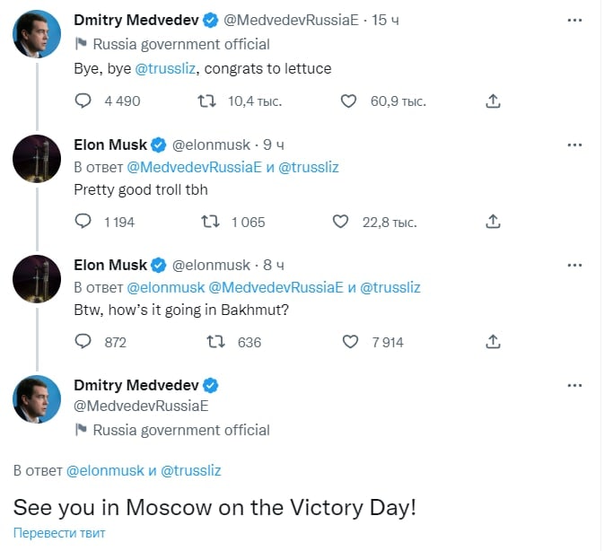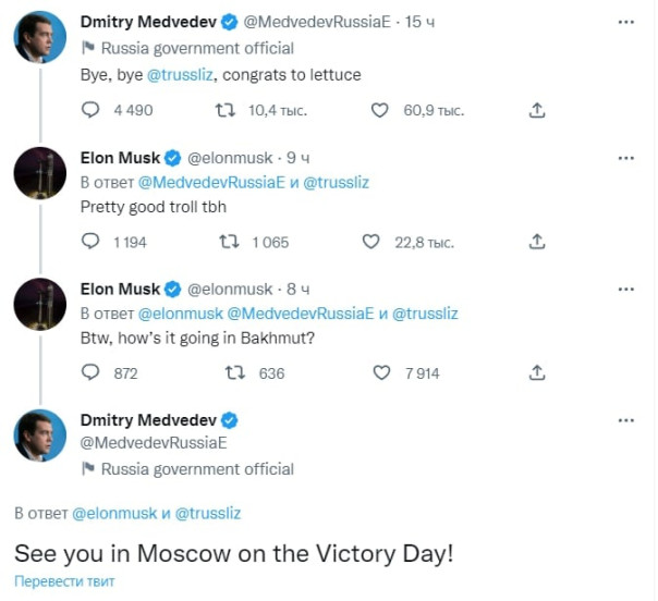 На вчерашний пост в Твиттере Дмитрия Медведева, в котором он прощается с Лиз Трасс и поздравляет салат латук с победой в соревновании на «срок годности», отреагировал Илон Маск. Бизнесмен отметил шутку Медведева, а затем спросил, как дела в Артемовске, за который сейчас идут бои.